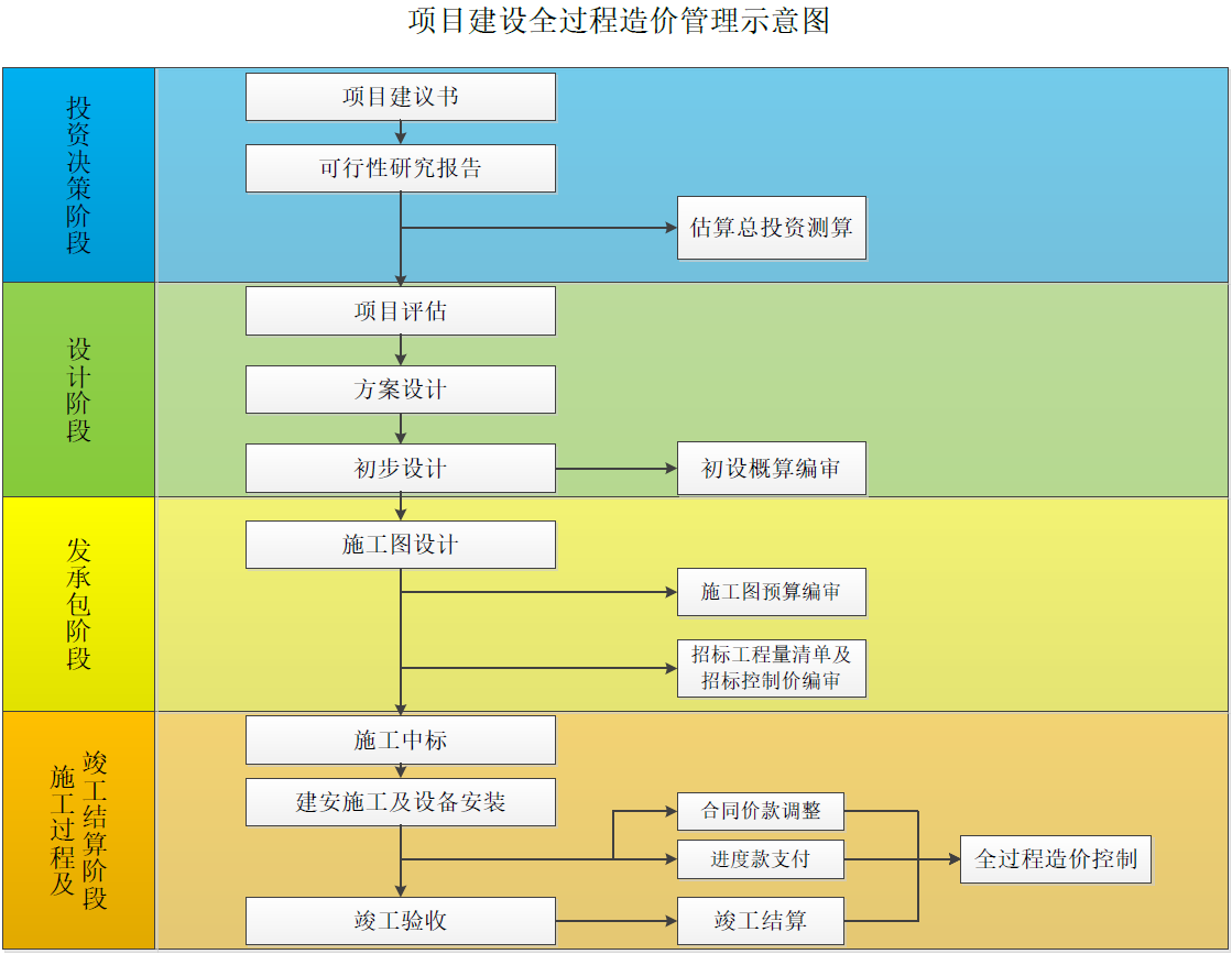 實踐中,建設(shè)工程全過程造價管理可以概括為貫穿于項目建設(shè)過程中的4個階段,分別為項目的決策階段、設(shè)計階段、發(fā)承包階段、施工過程以及竣工結(jié)算階段。