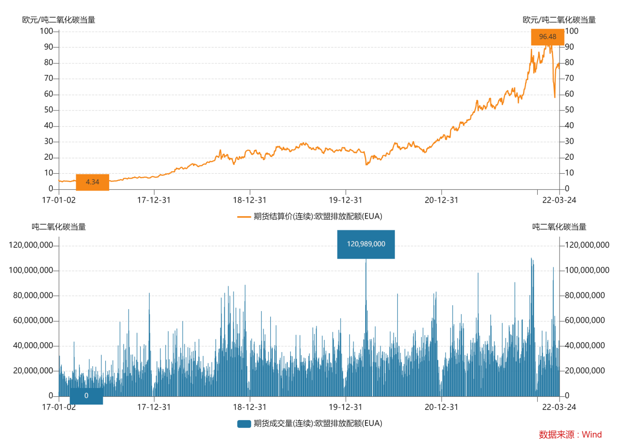 圖 5歐盟碳排放配額歷史結(jié)算價及成交量