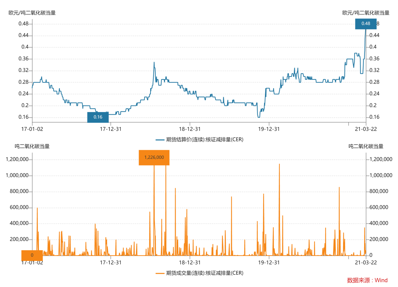 而對于另一交易標(biāo)的CCER,參考在全國碳排放權(quán)交易市場第一個履約周期內(nèi)年覆蓋溫室氣體排放量約45億噸CO2,按照目前最高5%的碳排放配額抵消比例,估算每年CCER需求量約為2.25億噸,在當(dāng)前發(fā)改委已暫停CCER項目逾四年的背景下,預(yù)計短期有較強(qiáng)的供需錯配帶來的價格支撐。中遠(yuǎn)期來看,我國目前最高5%的抵消比例仍遠(yuǎn)低于歐盟13%的限制,筆者認(rèn)為伴隨國內(nèi)CCER項目備案的重啟及抵消比例的逐步放開,CCER的中期價格也將有上行支撐。但不同于CEA的總量控制,CCER伴隨可再生能源如光伏、風(fēng)電、水電裝機(jī)量的攀升,及甲烷利用、林業(yè)碳匯等項目的增多,供給端也將呈現(xiàn)上行曲線,故遠(yuǎn)期來看,CCER難以達(dá)到CEA的價值高度,這是由其內(nèi)在產(chǎn)生機(jī)制決定的。參考?xì)W盟EUA及CER的歷史價格和成交量在同期的差異也不難發(fā)現(xiàn),CER即便是在EU-ETS這樣的成熟碳交易市場,也僅僅可作為碳配額交易的一種衍生補(bǔ)充。