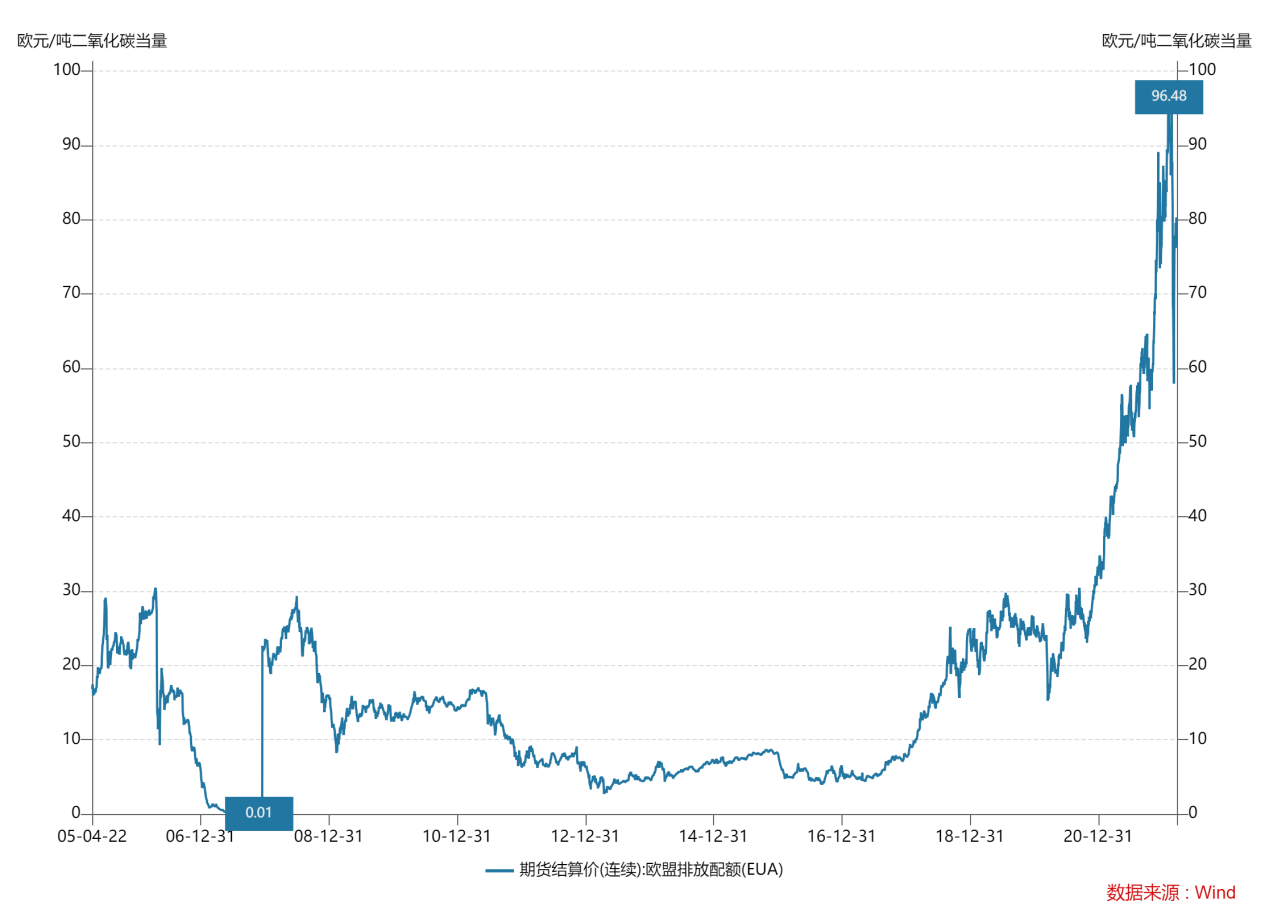 圖 1 歐盟排放配額歷史結(jié)算價