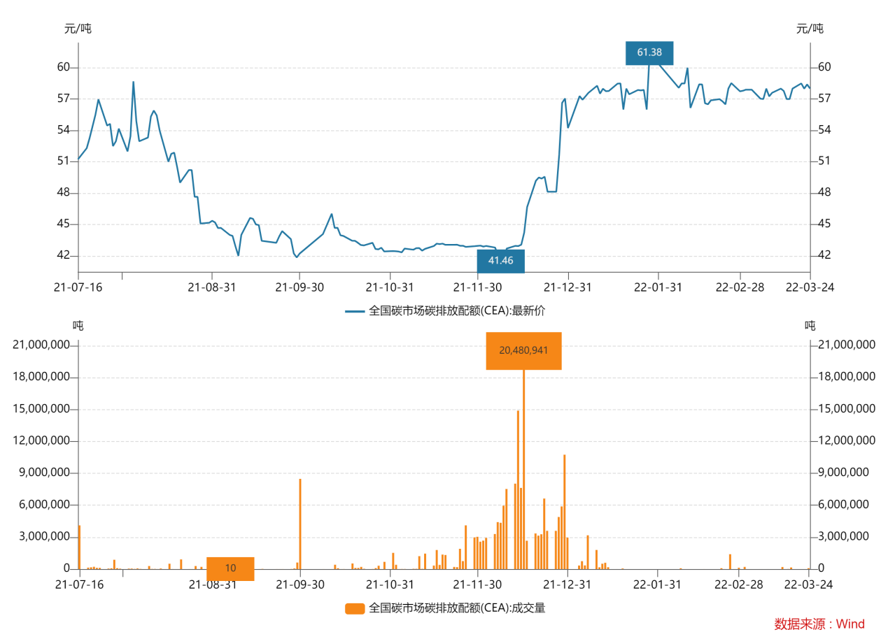 圖 3全國碳市場排放配額結(jié)算價及成交量走勢
