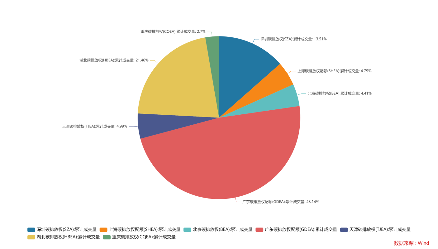 我國于十二五期間正式提出轉(zhuǎn)變經(jīng)濟(jì)結(jié)構(gòu)、控制二氧化碳排放,并先后在七個省市開展了碳排放權(quán)交易試點(diǎn)工作。交易標(biāo)的為碳排放配額(CEA,地方交易所命名方式不同),CEA類似歐盟的EUA,也是由政府自上而下完成分配。若企業(yè)實際碳排放量小于政府分配的配額,則企業(yè)可以通過交易多余碳配額,來實現(xiàn)碳配額在不同企業(yè)的合理分配。CEA由省級生態(tài)環(huán)境主管部門免費(fèi)或有償分配,各省的碳排放配額,則由生態(tài)環(huán)境部根據(jù)國家溫室氣體排放控制要求綜合考慮后制定。地方試點(diǎn)的積極推進(jìn)為后續(xù)全國碳市場建設(shè)積累了寶貴經(jīng)驗,根據(jù)生態(tài)環(huán)境部公布的數(shù)據(jù),截至2021年6月全國碳市場上線前,地方性試點(diǎn)市場已基本覆蓋了電力、鋼鐵、水泥等20多個行業(yè)近3000家重點(diǎn)排放單位,累計配額成交量4.8億噸二氧化碳當(dāng)量,成交額約114億元。但地方試點(diǎn)的局限性同樣明顯,由于此階段各交易所主體僅限省市范圍內(nèi)控排企業(yè),具有明顯的區(qū)域壁壘特征,同時源于各省市產(chǎn)業(yè)結(jié)構(gòu)、經(jīng)濟(jì)發(fā)展水平、溫室氣體控制目標(biāo)不同,各交易所配額價格及成交量呈現(xiàn)明顯差異。截至2022年3月,廣州+深圳碳排放權(quán)配額累計成交量占全國市場的份額超60%,而重慶、天津、上海、北京則不足5%,由此也間接證明了廣東在全國節(jié)能減排、經(jīng)濟(jì)結(jié)構(gòu)轉(zhuǎn)型上依然走在改革前沿。七大碳排放交易所累計成交量占比如下圖所示(注:福建碳排放交易所未公布累計成交量,暫不納入統(tǒng)計):