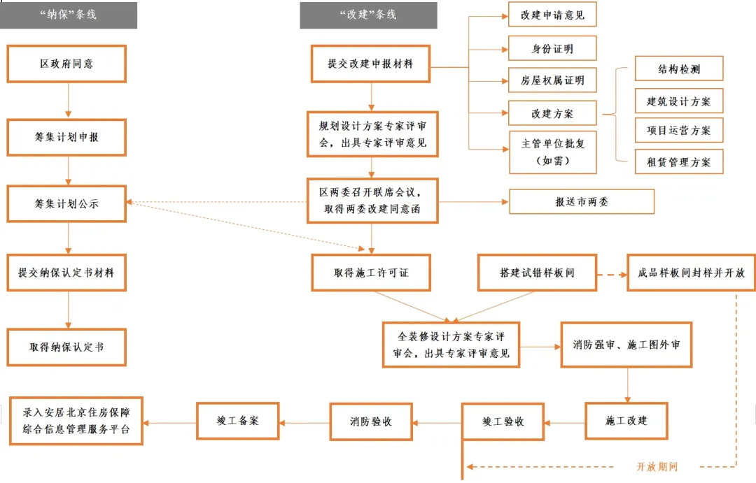 項(xiàng)目的申請(qǐng)和審批有“納保”和“改建”兩種方式:“納保”指經(jīng)政府同意后,項(xiàng)目納入保障性租賃住房年度建設(shè)籌集計(jì)劃,并取得保障性租賃住房項(xiàng)目認(rèn)定書(shū),繼而享受國(guó)家政策優(yōu)惠的過(guò)程;“改建”指實(shí)施主體按照有關(guān)要求將現(xiàn)有存量建筑裝修改建為保障性租賃住房的過(guò)程。流程具體如下圖(以北京市為例):
