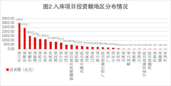 項(xiàng)目投資額排序:四川省、甘肅省、安徽省、湖南省、山西省位列前五,分別為2959.63億元、2415.40億元、1505.87億元、1345.58億元、1151.18億元,占入庫項(xiàng)目總投資額的58.11%(詳見圖2)。前五省份投資額合計(jì)占扣除退庫后項(xiàng)目總投資的58.11%,其中四川省以2959.63億元居首,甘肅省、安徽省緊隨其后,西部地區(qū)及華南地區(qū)在重大項(xiàng)目投資中表現(xiàn)突出。