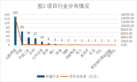 項(xiàng)目行業(yè)數(shù)量統(tǒng)計(jì)發(fā)現(xiàn),公路橋梁、環(huán)保、市政工程、水利、公共住房行業(yè)位列前五,項(xiàng)目數(shù)量分別為130個、64個、36個、32個、16個,項(xiàng)目總數(shù)占入庫項(xiàng)目比例為92.05%(詳見圖3)。