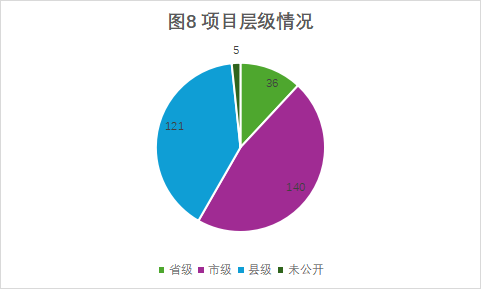 項(xiàng)目層級:根據(jù)項(xiàng)目公開情況,能夠確定項(xiàng)目層級的項(xiàng)目數(shù)量為297個,其中省級項(xiàng)目36個,市級項(xiàng)目140個,縣級項(xiàng)目121個,未公開項(xiàng)目層級的5個(詳見圖8)。