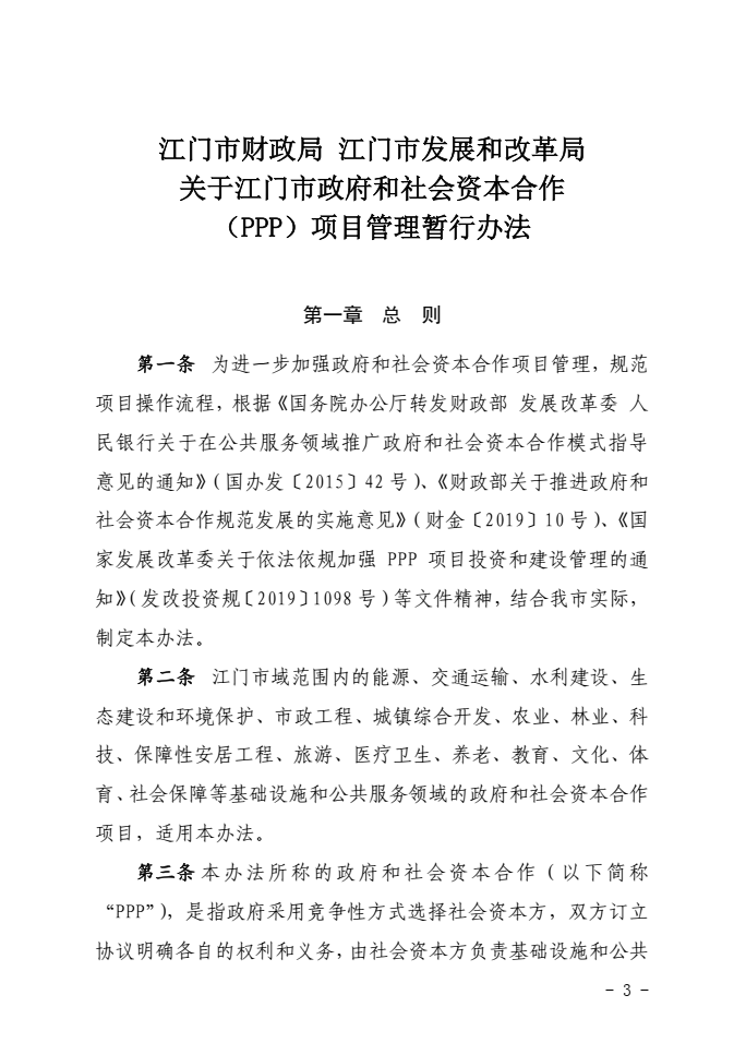 為進(jìn)一步加強(qiáng)江門市政府和社會資本合作(PPP)項(xiàng)目管理,規(guī)范項(xiàng)目操作流程,江門市財(cái)政局聯(lián)合江門市發(fā)展和改革局制定出臺了《江門市政府和社會資本合作(PPP)項(xiàng)目管理暫行辦法》(江財(cái)規(guī)〔2022〕1號)(以下簡稱《暫行辦法》),并于2022年4月經(jīng)江門市人民政府同意正式印發(fā)。